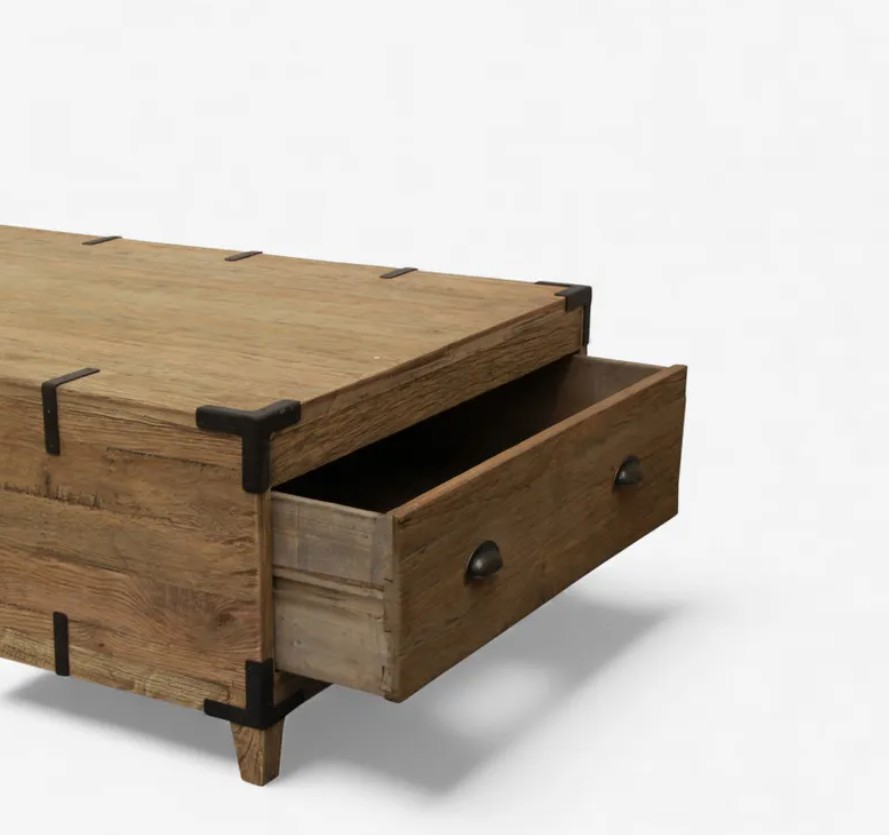 Chunky trunk style coffee table made from reclaimed oak with metal hardware and detailing. Features a drawer at each end for added storage.